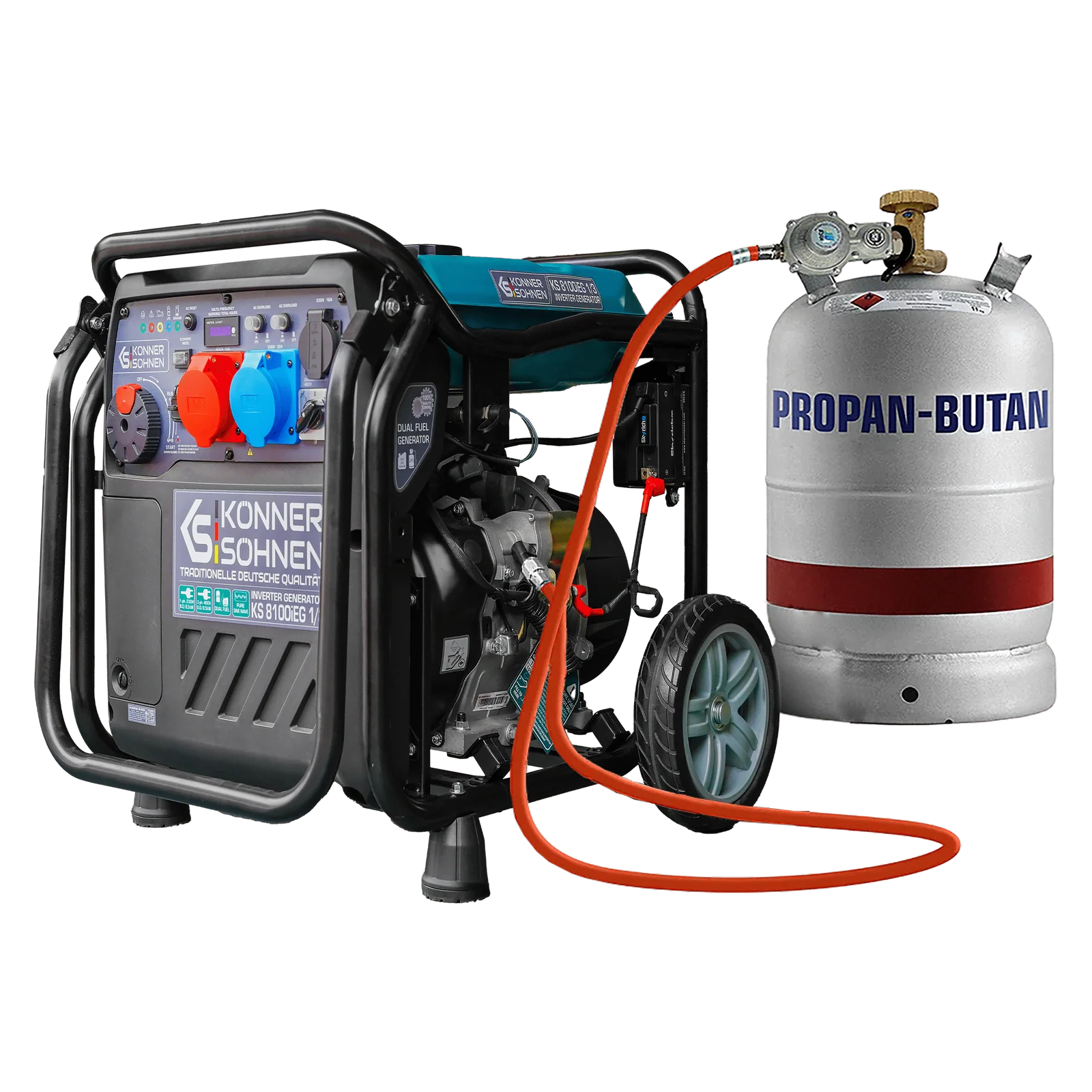 KS 8100iEG 1/3 invertergeneraatoril on kahe kütusega mootor (LPG/bensiin) maksimaalse väljundvõimsusega 8,5 kW bensiinil; võimsus väheneb LPG-l 10%. Varustatud VTS-süsteemiga 1- või 3-faasiliseks tööks ilma võimsuse kadumiseta. Stabiilne 230 V 50 Hz pinge tagab ohutuse tundlikele elektroonikaseadmetele nagu meditsiini- või AV-seadmed. Lihtne 3-ühes käivitus, kvaliteetne vaskmähisega generaator. Mugav juhtpaneel LED-ekraani, USB ja pistikupesadega: 1×16 A (230 V), 1×32 A (230 V), 1×32 A (400 V). Sisaldab LPG tarvikuid: sisseehitatud reduktor, 1,5 m voolik ja lisareduktor gaasiballooni ühendamiseks.