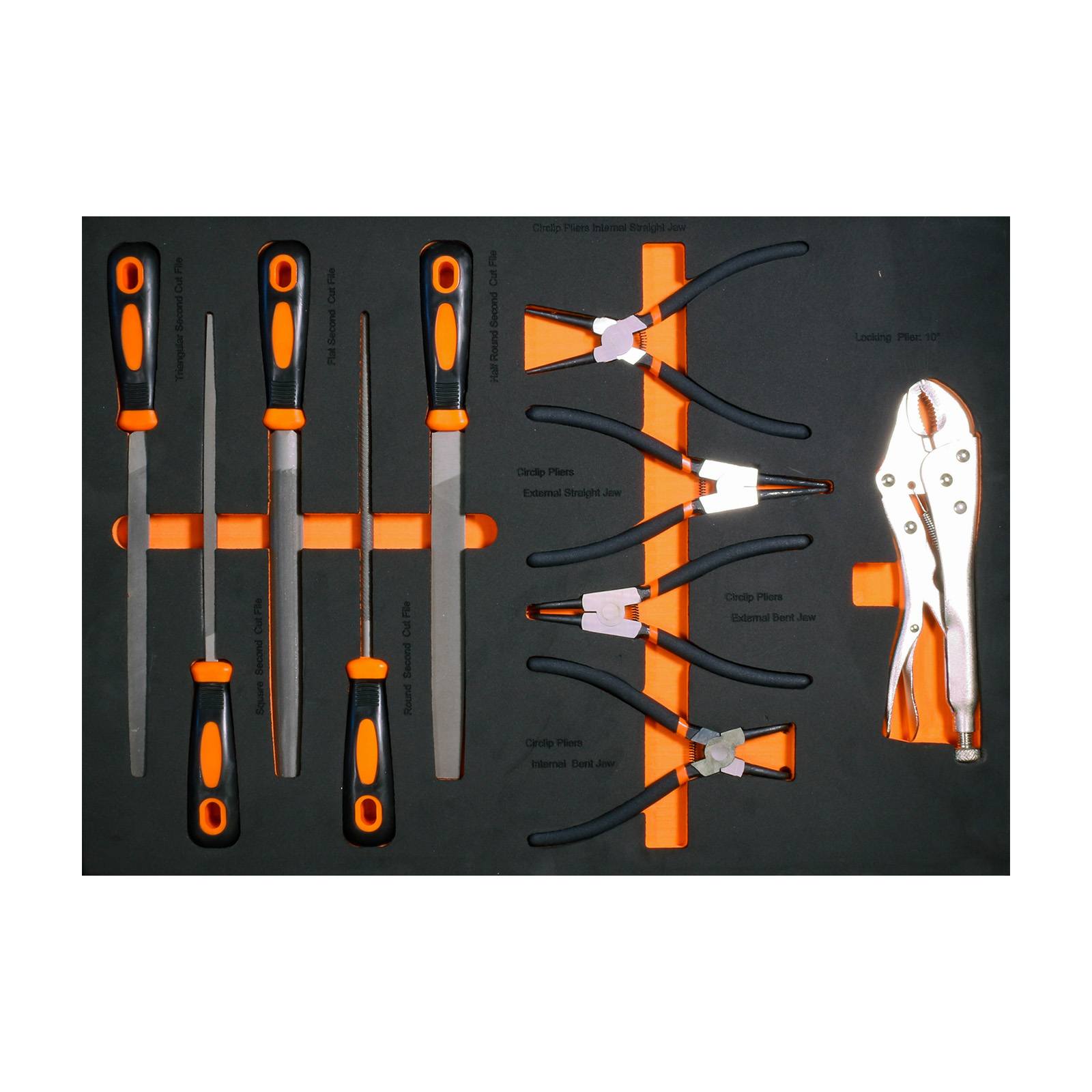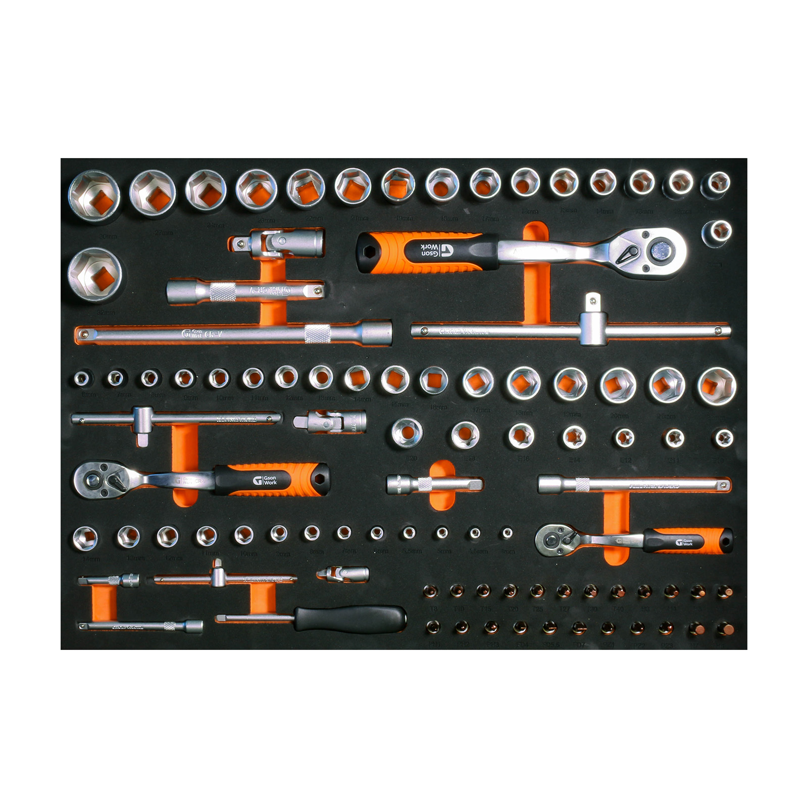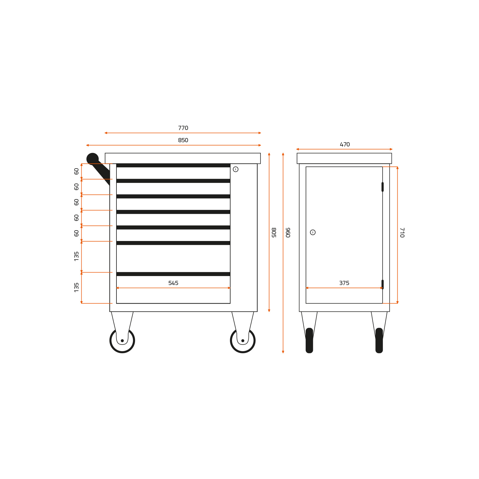 Tööriistakapp ratastel seitsme turvalukustusega sahtli ja külgkapiga tööriistade ja aerosoolide hõlpsaks hoiustamiseks. Igal kroomvanaadiumterasest tööriistal on oma kindel ja tähistatud koht korrastatuks hoidmiseks. Integreeritud lukk võimaldab kõiki sahtleid korraga lukustada, vältides juhuslikku avanemist kapi liigutamisel. Tööriistakapi ülaosas on sektsioonid sageli kasutatavate tööriistade hõlpsaks ligipääsuks. Tööriistakapil on ka külgmine käepide, mis hõlbustab liigutamist, ja üks ratas on lukustatav.