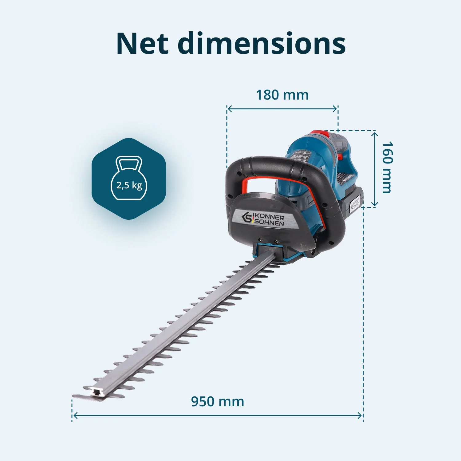 Akuga hekilõikur Könner & Söhnen®-ilt on parim lahendus aia hooldamiseks. Seda toidab liitiumioonaku, mistõttu paistab see silma autonoomse töö ja mugava ligipääsuga territooriumi kaugematesse piirkondadesse (kaabli puudumise tõttu). Lisaks ei vaja see keerulist hooldust.