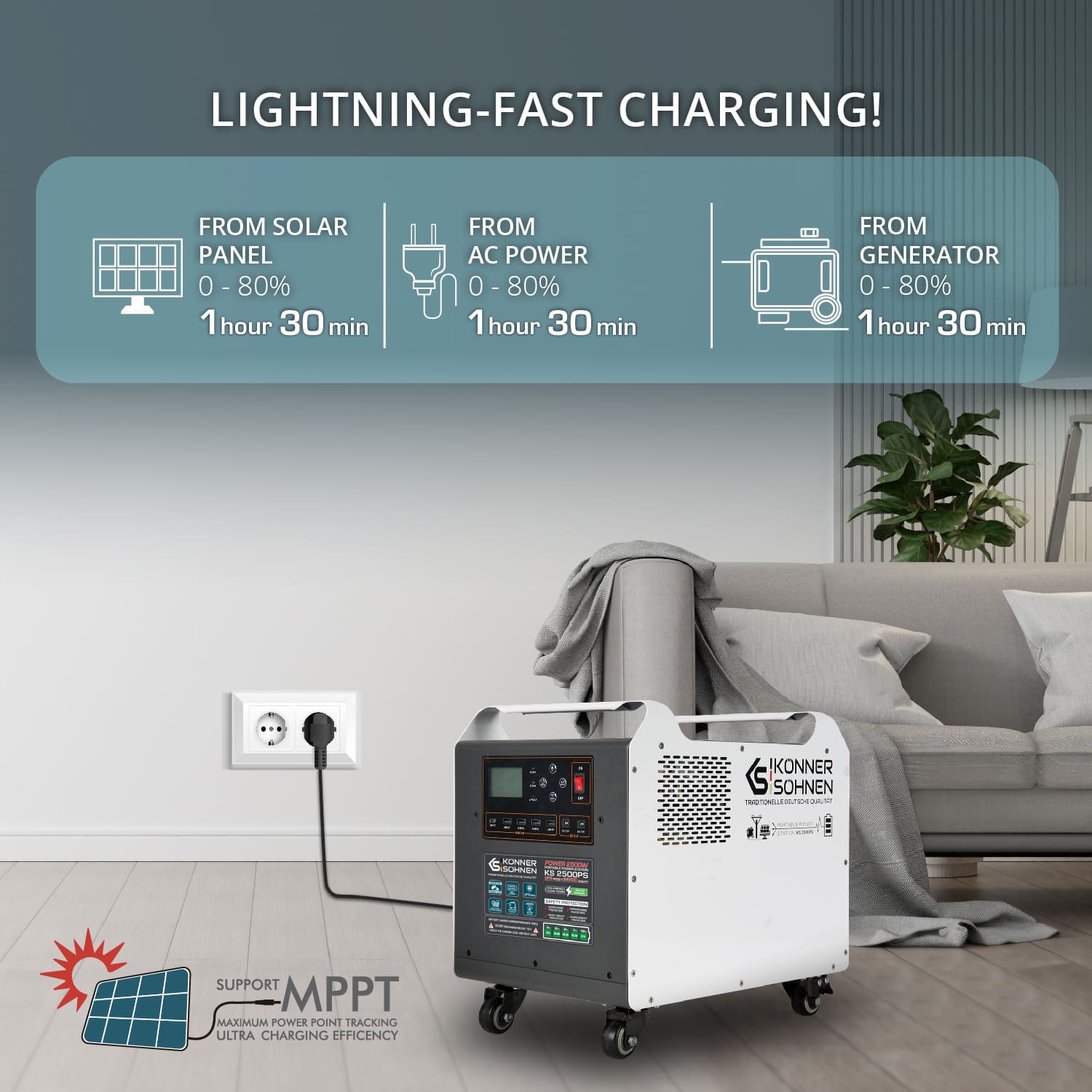 Könner & Söhnen® elektrijaamad on mugavad kõik-ühes seadmed – need ühendavad endas taaslaetava aku, päikeseinverteri päikesepaneelide ühendamise võimalusega ja puhta siinuslaine väljundiga katkematu toitesüsteemi. Need sobivad suurepäraselt tundlike seadmete toiteks, sobivad suurepäraselt välitegevusteks ja neil on 10 pistikupesa erinevate seadmete samaaegseks ühendamiseks. Varustatud transpordirataste ja käepidemetega hõlpsaks transportimiseks.